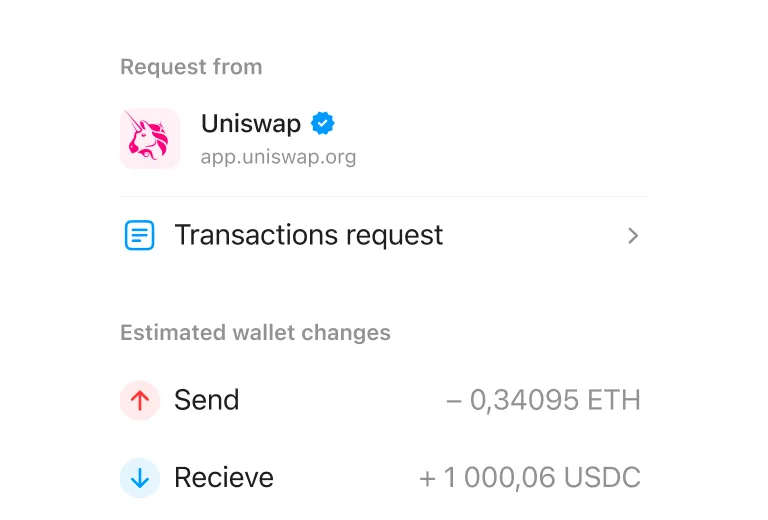 Veja exatamente o que uma transação fará antes de confirmá-la. Verificações de segurança integradas para que você não envie criptomoedas para o lugar errado.